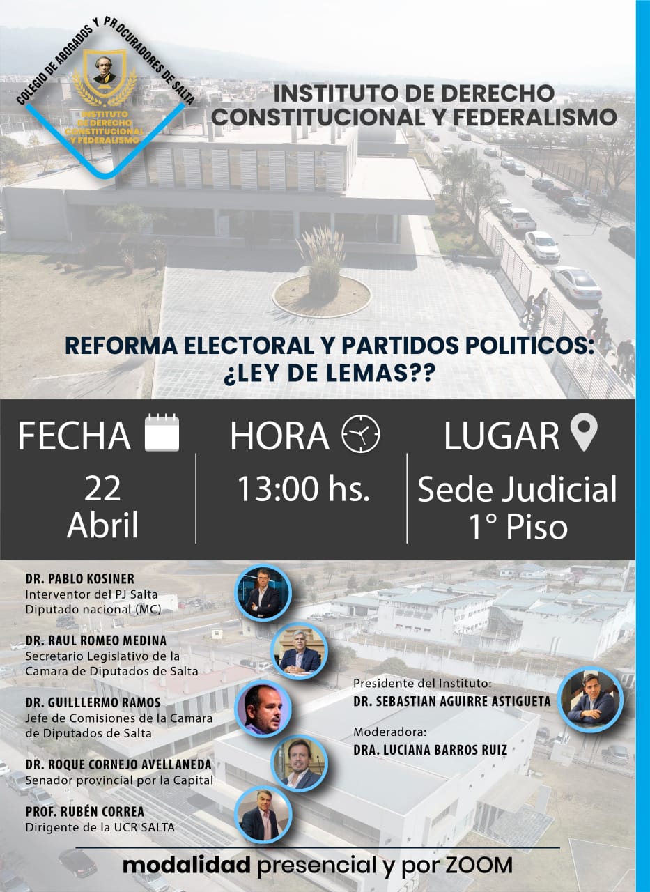 El Instituto de Derecho Constitucional y Federalismo del Colegio de Abogados y Procuradores de Salta convoca a la comunidad jurídica y ciudadana a participar de la jornada de debate titulada “Reforma Electoral y Partidos Políticos: ¿Ley de Lemas?”