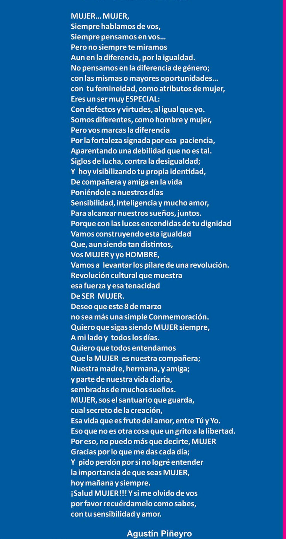 Y decirles a los que tienen la responsabilidad de velar por ellas, que más que declamaciones bonitas, pongan lo que tienen que poner, para que no tengamos más femicidios, y que tengan la necesaria contención y oportunidad de ser MUJER, sin discriminación y ser una compañera y amiga, más que una esclava.