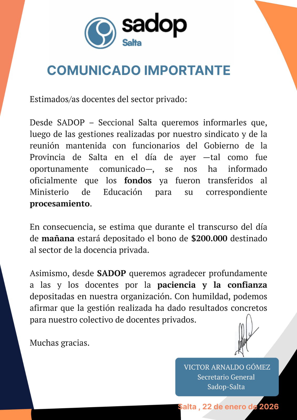 En un comunicado de SADOP Salta, con la firma de su secretario general, Víctor Gómez, se ha informado esta tarde que el bono de Pesos DOSCIENTOS MIL, que estaba programado que los docentes cobraran el pasado 16 de enero, será depositados mañana 23 de enero, en las cuentas de cada uno de los docentes del sector privado, para ser cobrado por cajeros automáticos.