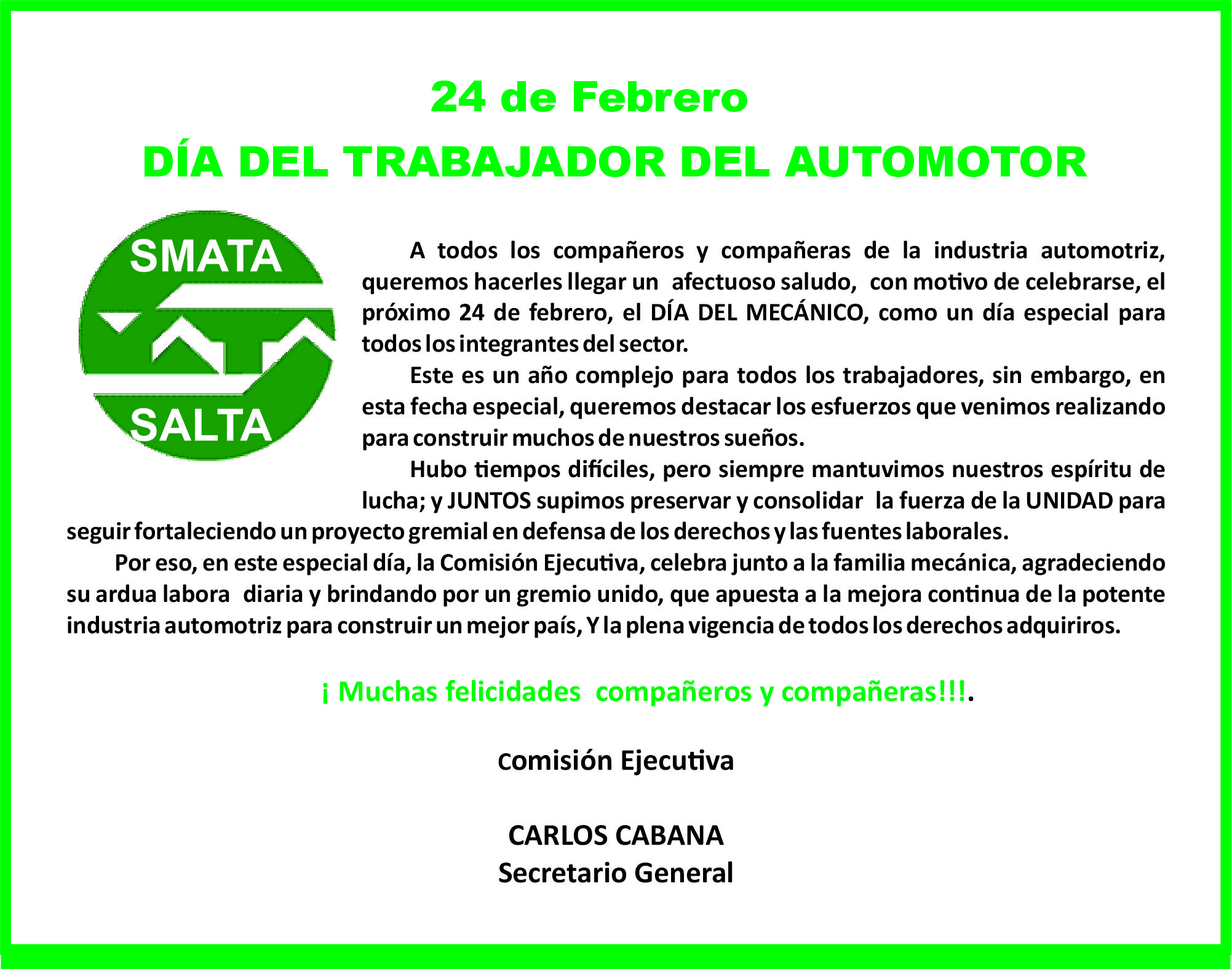 Mañana, 24 de febrero, se conmemora el DÍA del Trabajador/a de los trabajadores Mecánicos y Afines del Transporte Automotor (SMATA), en todo el país. Es día no laborables y pago para todos los trabajadores del sector. Y por tal motivo CARLOS CABANA, Secretario General de la Seccional Salta, junto a la Comisión Ejecutiva, saluda a todos los trabajadores de la actividad muy expresamente.